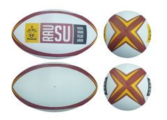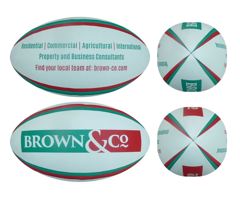 Professional-quality rugby ball featuring durable pimpled grain rubber construction with four stitched panels and inflatable bladder. Each panel can be customised with your branding using up to 4 spot colours.