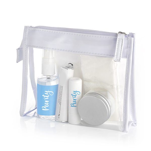 All items come neatly organized in a clear PVC travel bag with white trim. Branding options are available for the contents only, or for both the bag and contents.